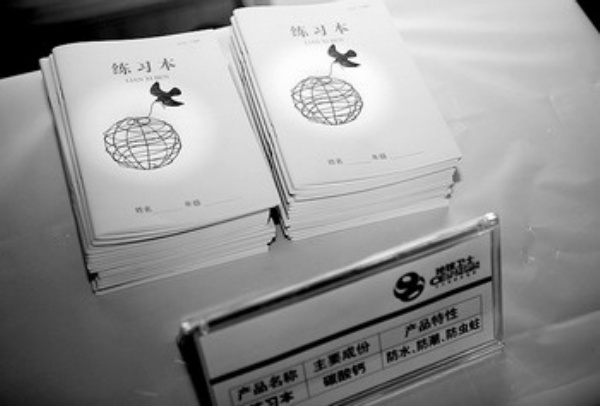 在北京科博会“节能减排与循环经济建设成果大会”上,一个名叫“地球卫士”的石头纸展位前围满了好奇的参观者,几名工作人员正耐心地讲解着这种新产品。下图为用石头纸做的购物袋和本子。(顾 阳摄)