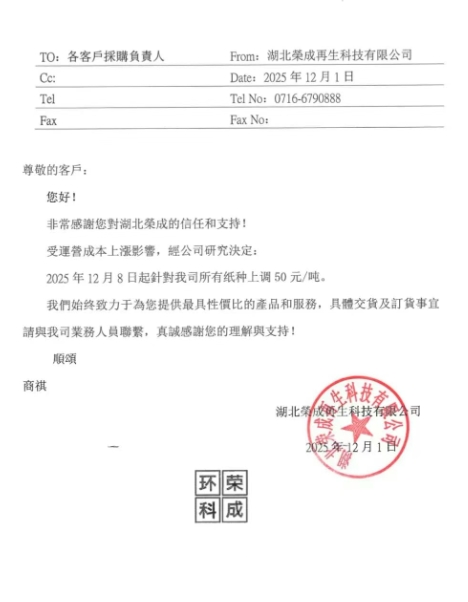12月8日起,针对我司所有纸种上调 50 元/吨。