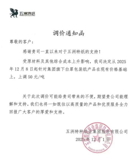五洲特纸12月涨价函(2025-12-02)