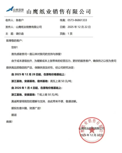 山鹰纸业发布多基地调价政策(2025-12-23)