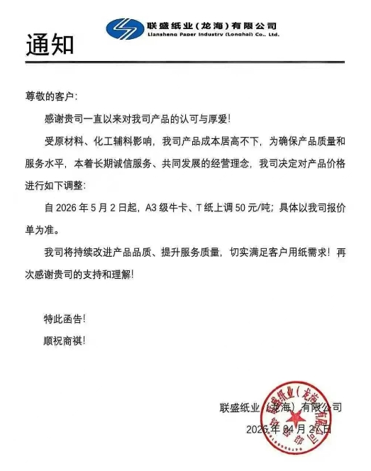 联盛纸业发布5月初调价函(2026-04-28)