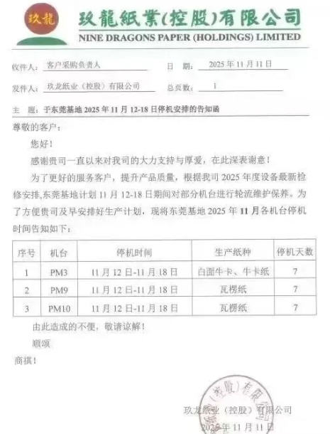 东莞玖龙发布11月停机函(2025-11-12)