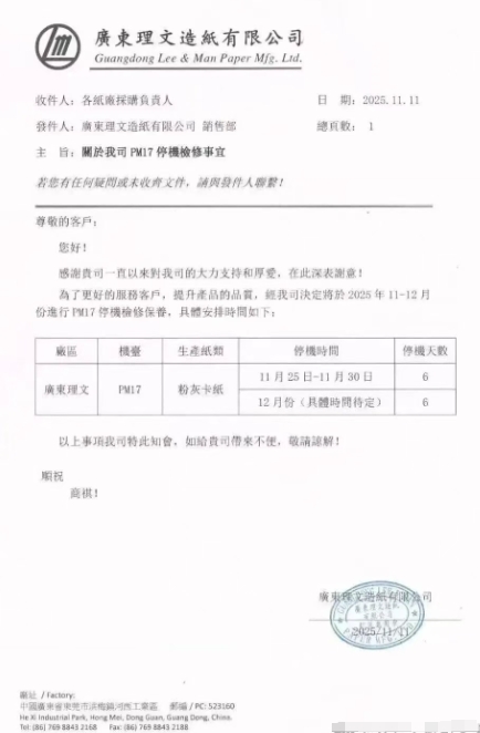 广东理文发布停机检修计划(2025-11-12)