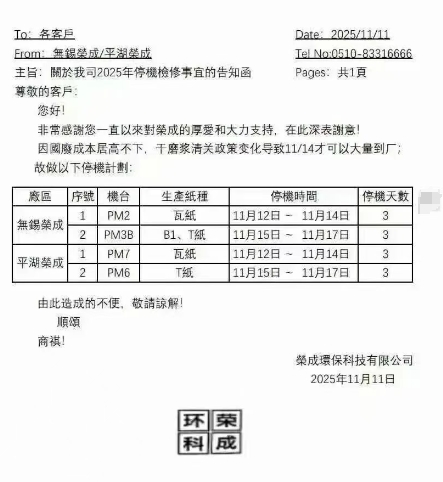无锡荣成/平湖荣成停机检修告知函(2025-11-12)