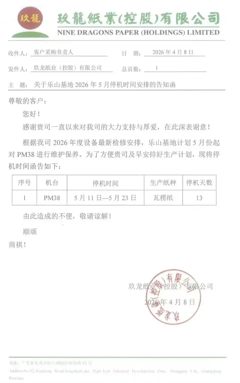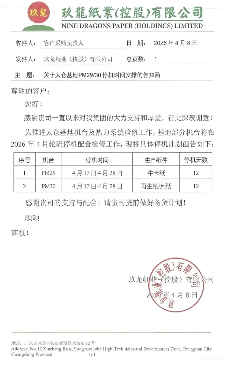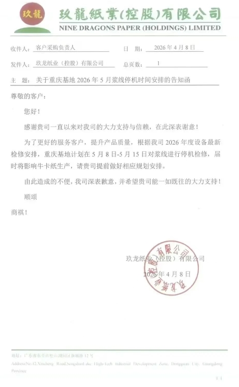 玖龙部分基地发布4-5月停机检修计划(2026-04-10)