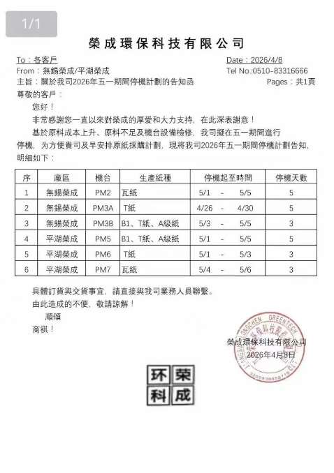 无锡及平湖荣成发布五一假期停机计划(2026-04-10)