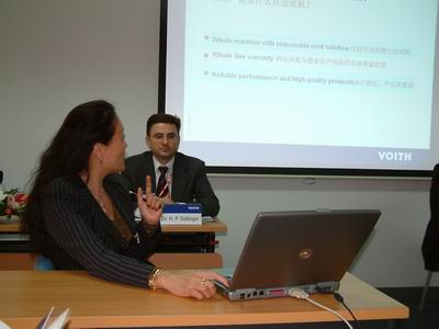 Voith造纸技术中国区总裁刘明明女士演讲中国需要“同一供应商提供整台纸机”的解决方案