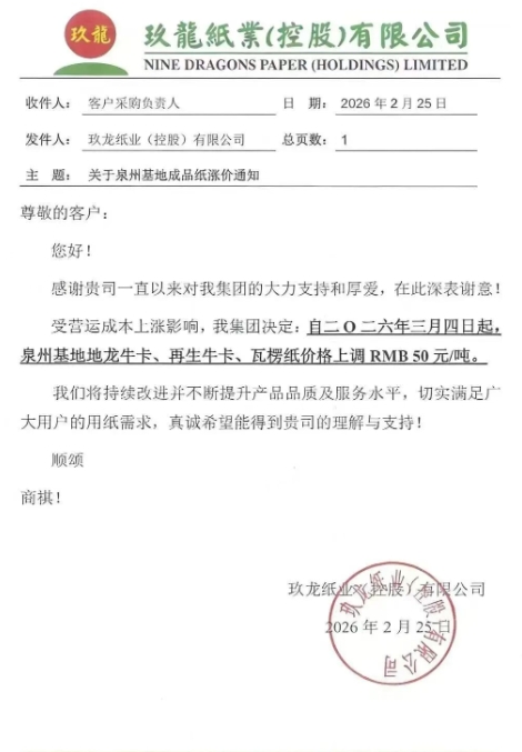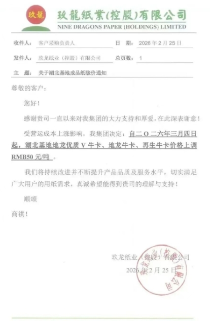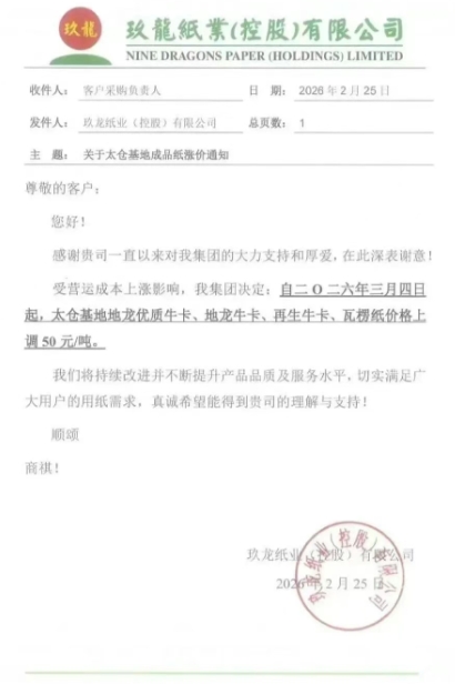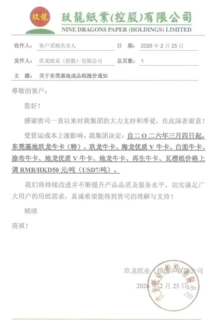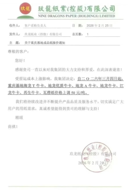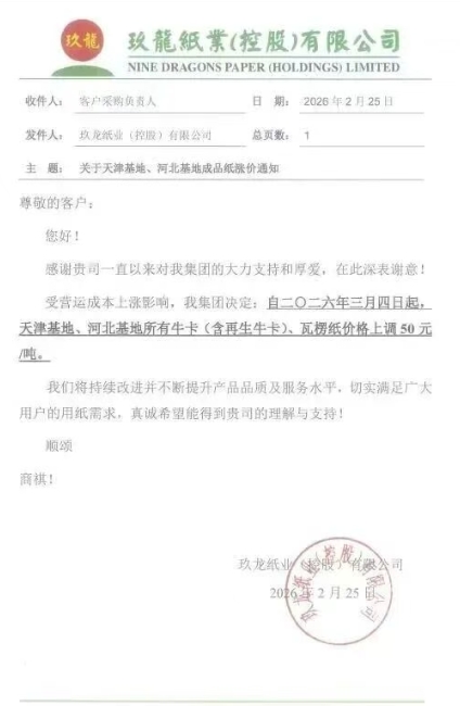 玖龙纸业多基地发布牛卡纸、瓦楞纸涨价函(2026-02-26)