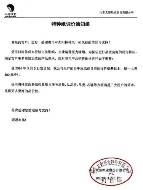 自2026年3月5日发货起,我公司生产的白牛皮纸在目前执行价格基础上,统一上调300 元/吨。
