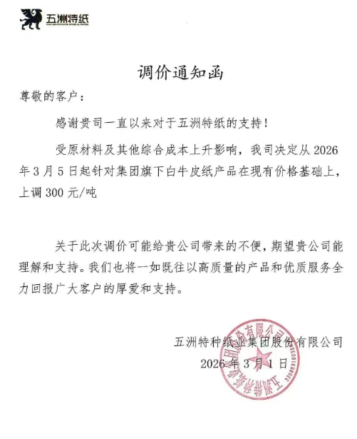 五洲特种纸业集团股份有限公司:受原材料及其他综合成本上升影响,我司决定从2026年3月5日起针对集团旗下白牛皮纸产品在现有价格基础上,上调300元/吨。