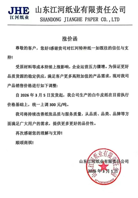 自2026年3月5日发货起,我公司生产的白牛皮纸在目前执行价格基础上,统一上调 300 元/吨。